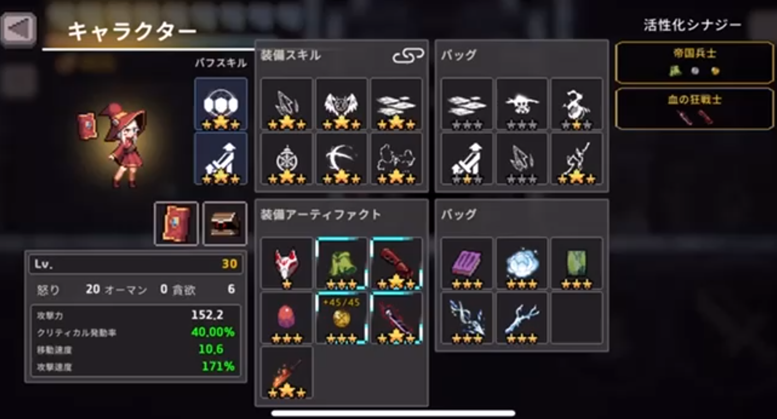 遺物:不死の霊薬、破れた日誌Ⅴ、が必須級。あとは適当なシナジー(奇妙な神の仮面、狙撃手のマント系など)か単品遺物(禁術:召喚スクロール、破れた日誌Ⅳなど)を入れよう。