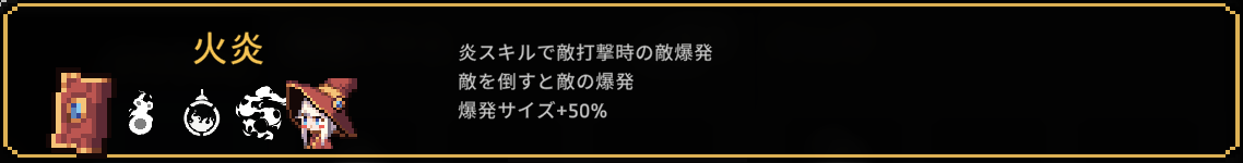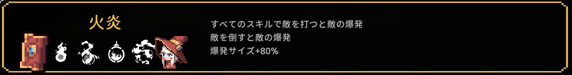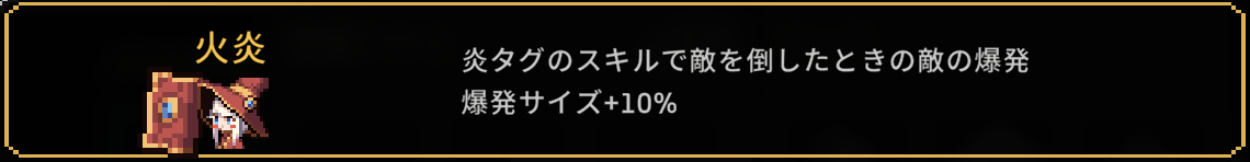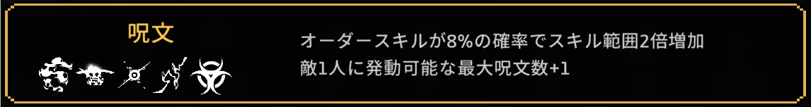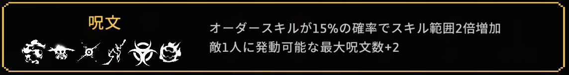 | 2 | スキル範囲+10% 呪いスキルに襲われた敵が3秒間受けるダメージ+5% ネストできません |